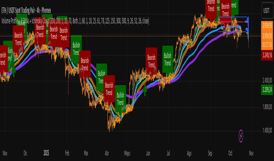 This script merges three proven concepts — Volume Profile, 8 customizable EMAs, and Ichimoku Cloud — into a single overlay that helps traders quickly identify **high-probability zones for entries and exits.