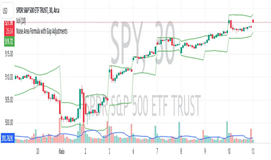 This version of the Noise Area Pine Script, developed with the assistance of ChatGPT, includes adjustments for opening gaps to better account for overnight price changes that affect the market open. This Pine Script is designed to provide traders with a dynamic visualization of the Noise Area based on the volatility of the last 14 trading days. It calculates the upper and lower boundaries using the daily opening price, representing typical price movements relative to the open. This helps identify significant deviations, potentially indicating the start of a trend.