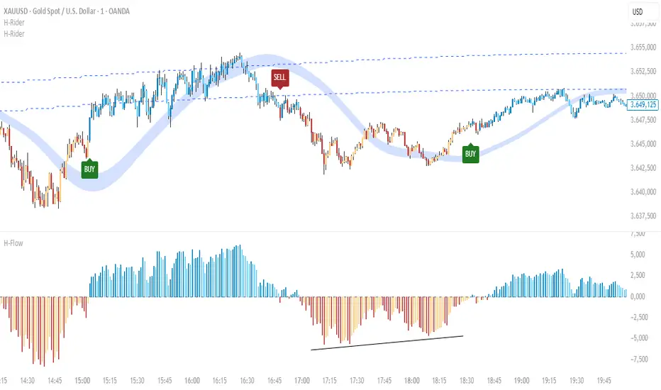 Heikin Flow is a trend and momentum oscillator built on a smoothed reverse-Heikin-Ashi baseline. It quantifies the distance between price and this baseline, then colors the histogram to reflect both direction and acceleration/deceleration. Use it standalone to read trend energy and shifts, or pair it with Heikin Rider for momentum-aware breakout confirmation.