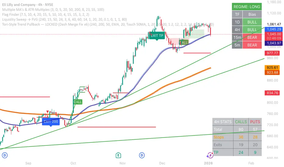 This indicator implements a strict, non-discretionary 4H trend-pullback model.