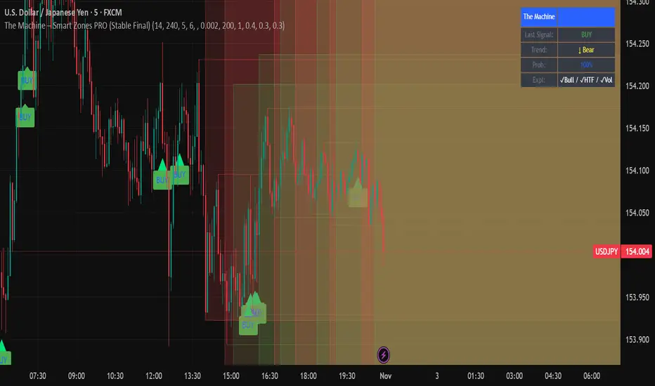 The Machine – Smart Zones PRO is an advanced multi-timeframe support/resistance and signal engine designed to reveal where smart money builds, manipulates, and distributes liquidity.