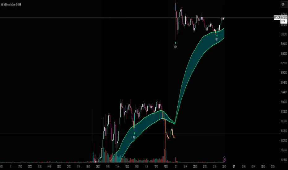 Adaptive EMA Zone (38/62) — Highlights pullback areas with dynamic aqua fill and transparency linked to trend strength.