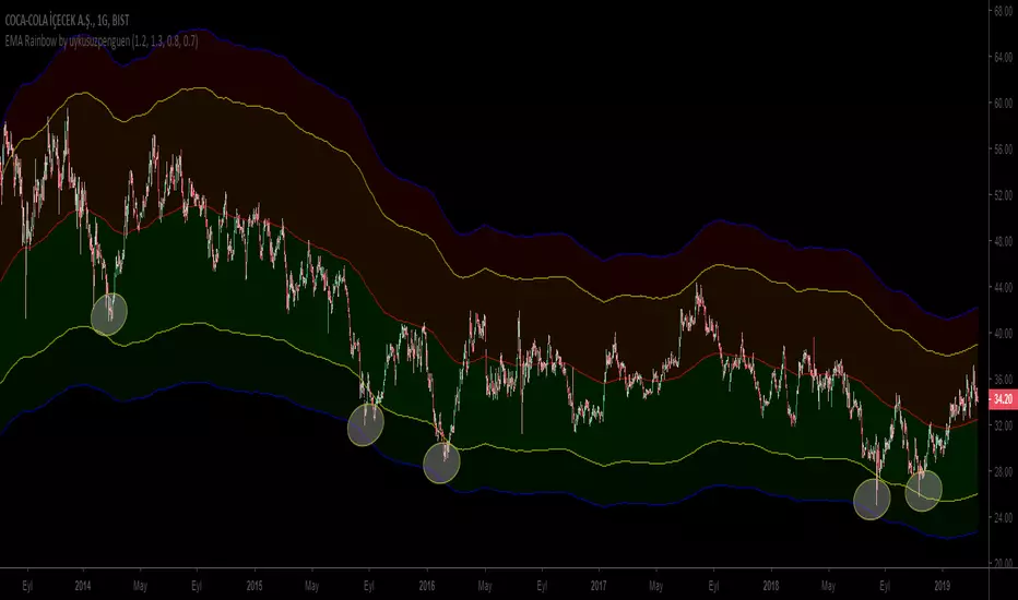 EMA Rainbow is a rainbow which is formed by multiplying the moving average by certain proportions and reflecting up and down on the ema200. According to the observations, dark green areas are strong buying areas, dark red areas are strong sales regions. Trading decisions can be made according to the line breaks or the regions in which the price movements. Rates can be edited in the settings section.