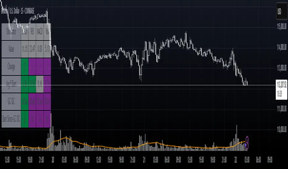 The "Oscillators Matrix" is a powerful and intuitive indicator designed to display key oscillator values in a table format on your TradingView chart. This script provides a quick overview of three popular oscillators: RSI (Relative Strength Index), MACD (Moving Average Convergence Divergence), and Stochastic Oscillator.