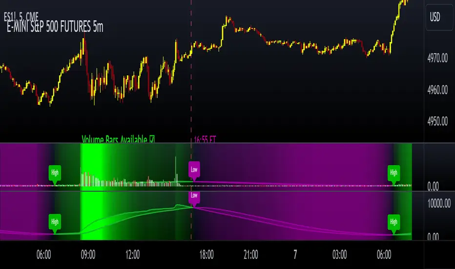 High and Low Volume Identification: It highlights periods of high and low volume relative to the average, using customizable color schemes for easy visual identification.