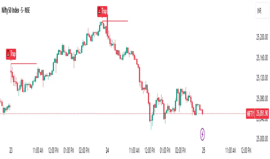 🟥 Red “🚨 Trap” labels above candles showing possible bull traps