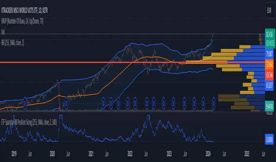 Der Indikator kann genutzt werden um die dynmamische Positionsgröße für einen ETF Sparplan zu berechnen. Dabei berechnet der Indikator wo sich der Preis des ETFs derzeit im BB befindet. Somit wird bei niedrigen Kursen mehr gekauft. Bei höheren weniger.