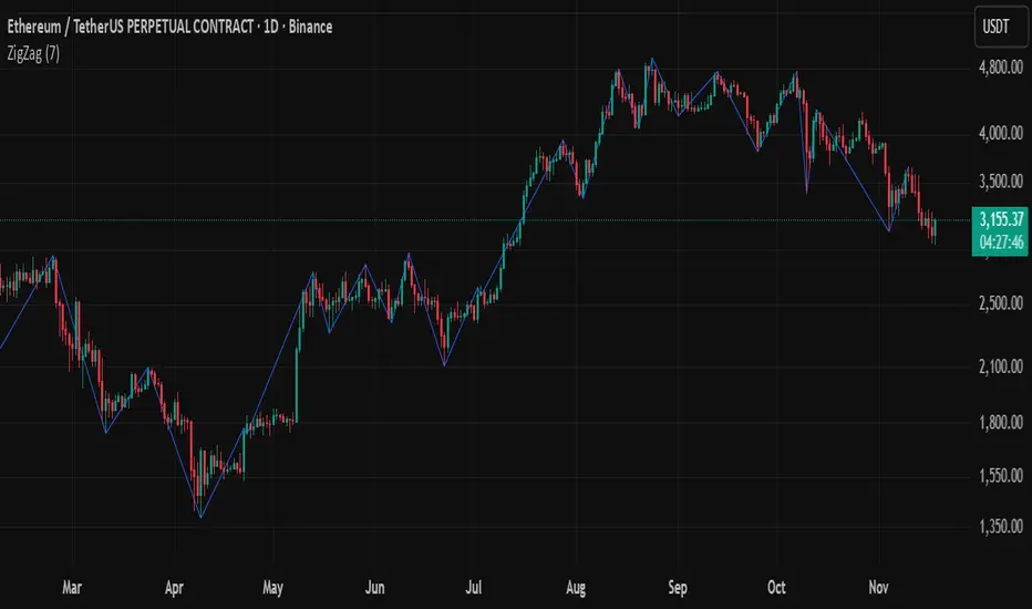 This ZigZag indicator highlights the most important swing highs and swing lows on the chart, helping traders see market structure more clearly by filtering out minor price movements. It connects significant turning points with straight lines, creating a clean visual representation of trend direction and major reversals.