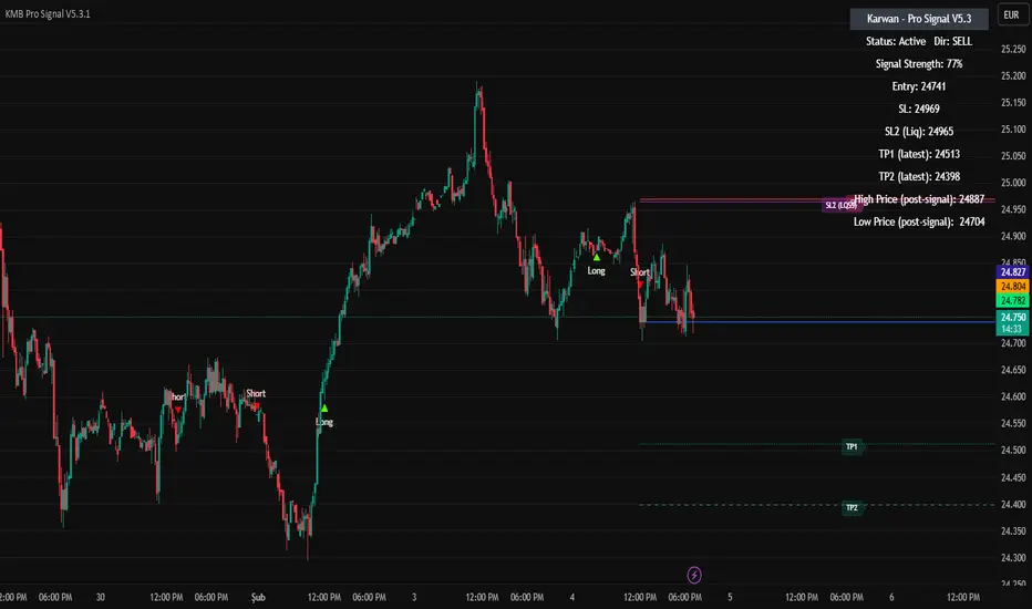 SL2 line (purple, optional): If enabled, a second stop level is shown as SL2 (LQSS). It’s an alternative “liquidity swing” stop level and also stays fixed once plotted.
