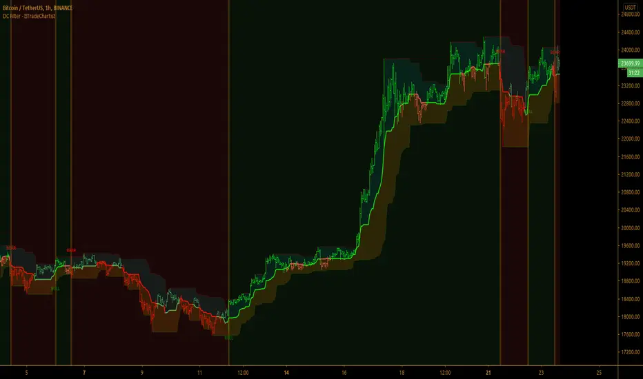 - Option to colour price bars using Donchian Channels price trend. The Donchian Channels basis line is plotted using the same colours as coloured bars as default.