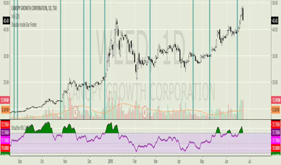 Highlights in blue when an inside bar follows an inside bar. Double inside bars (when used on the daily timeframe) are a way of easily finding equilibrium patterns (i.e. pennant shaped price action) on lower time frames. There is usually a strong move in whatever direction these patterns break, so good to have alerts set up for your favourite markets.