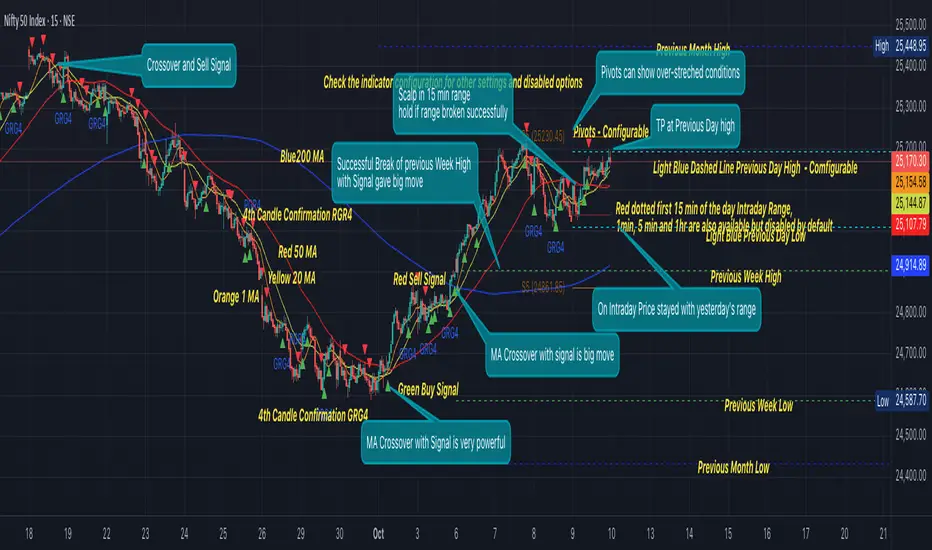 1. MA crossover and Signal - This is very powerful and provides a very big move. Trades can be held for longer. If after taking the trade we notice that the MA crossover has happened then trades can be held for higher targets.