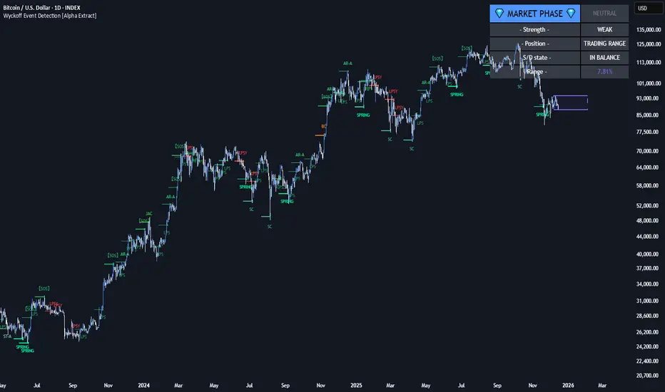 The script continuously tracks bullish and bearish event counts to determine whether the market is currently in an accumulation, distribution, or neutral phase. This allows traders to align their strategies accordingly.