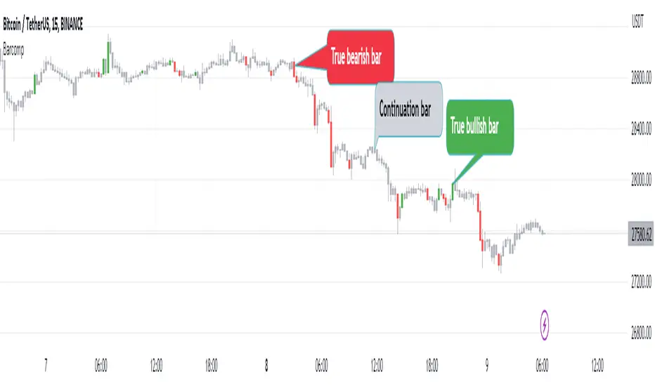 The indicator shows the true color of a bar based on the internal composition on 1 minute timeframe and the final outcome. It uses following parameters of 1minute and current timeframe inputs
