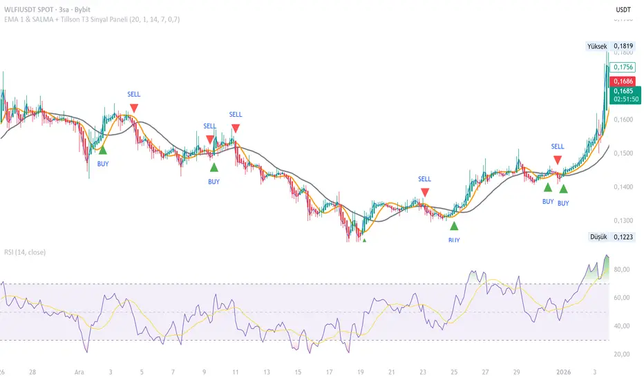 Strategy Logic OverviewThis indicator is a "Triple-Confirmation" trend-following system. It combines volume-weighted smoothing, immediate price action, and momentum filtering.1. Core ComponentsEMA 1 (The Trigger): Since the period is set to 1, this represents the raw price action. It acts as the fastest possible trigger to capture entries at the exact moment a trend shifts.SALMA (The Baseline): This is a double-smoothed moving average. It provides a stabilized support/resistance line that filters out market noise better than a standard SMA.Tillson T3 (The Trend Filter): Known for its low lag and extreme smoothness. We use this as a "Guardrail." We only take BUY signals when price is above the T3 and SELL signals when price is below it.RSI (The Momentum Filter): Ensures that we only enter a trade when there is sufficient strength ($> 50$ for Long, $< 50$ for Short).2. Signal Rules🚀 BUY SignalA green BUY label appears when:Crossover: EMA 1 crosses above the SALMA line.Trend: The current price is trading above the Tillson T3 line.Momentum: RSI is greater than 50.🔻 SELL SignalA red SELL label appears when:Crossunder: EMA 1 crosses below the SALMA line.Trend: The current price is trading below the Tillson T3 line.Momentum: RSI is less than 50.3. Execution & ManagementTake Profit (TP): Based on your preference, the suggested target is 2%.Alerts: The script includes alertcondition functions. You can set up TradingView alerts to send Webhooks to your quant infrastructure or bot, solving the "manual execution" problem you mentioned.