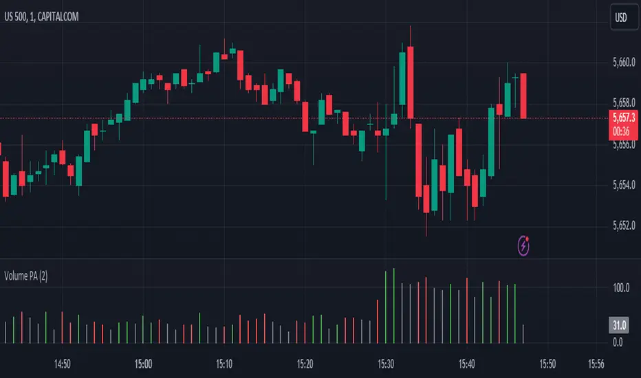 Custom volume histogram that visually represents trading volume in relation to the price action of the current bar. The histogram is colored based on whether the current bar is bullish or bearish, and it greys out when the current volume is lower than the volumes of the previous specified number of bars.