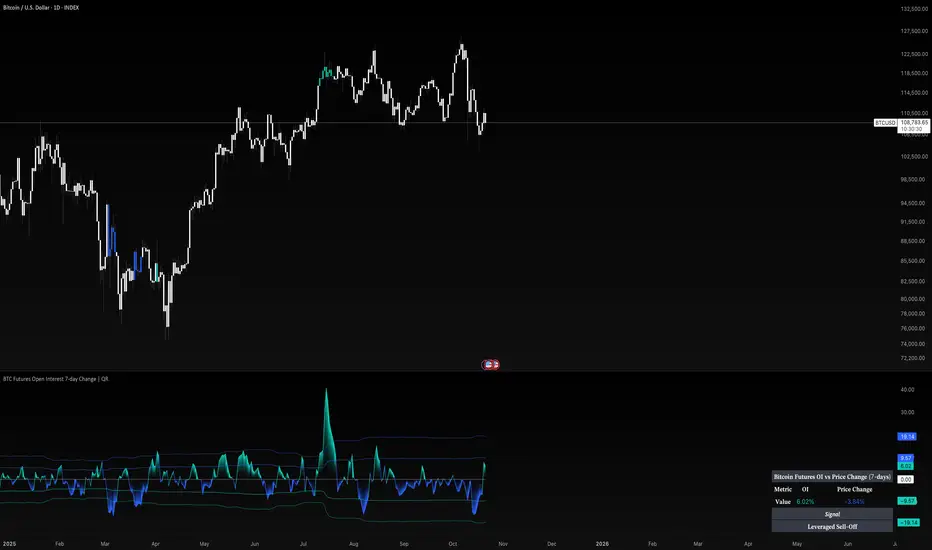 Volatility Context: A rolling standard deviation of OI ROC defines ±1σ and ±2σ bands. Bars are tinted when OI ROC exceeds ±2σ to highlight exceptional leverage shifts.