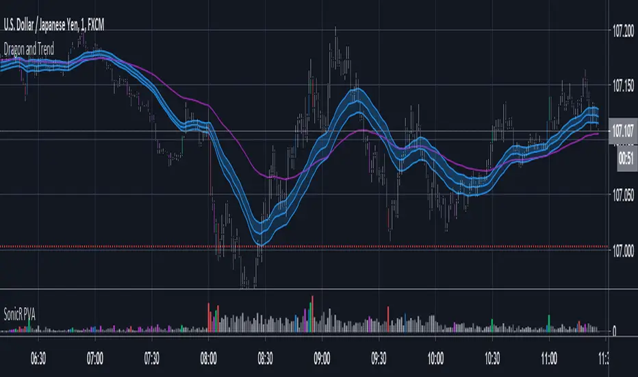 This Dragon Band and trend line indicators are based off Sonic R System. The Sonic R Dragon is based upon 34 EMA averaging of close prices with with high/low prices defining outer edges. The Sonic R Trend is based upon 89 EMA averaging of close prices. This indicator is highly recommended to be used with the Sonic R PVA Candles and Volume indicators, along with Price Volume Support Resistance Analysis (PVSRA) to help identify a classic or scout setup to time your entry into a trade.