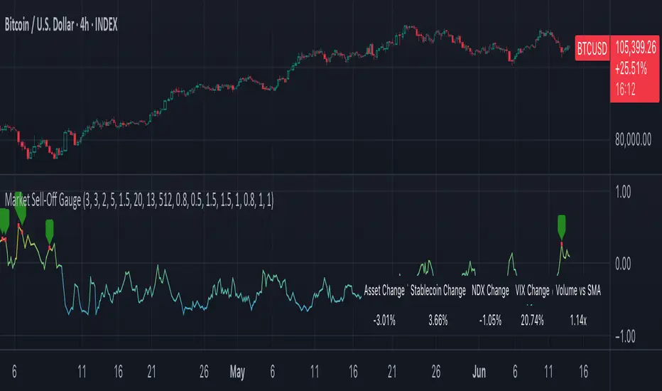 The Market Sell‑Off Gauge identifies high‑conviction, risk‑off entry opportunities by detecting broad market sell‑off behavior and rising stablecoin dominance, then confirming risk‑off sentiment via NDX weakness, VIX spikes, and elevated volume. It uses fuzzy logic and sigmoid scaling to convert raw signals into a smooth, bounded metric.