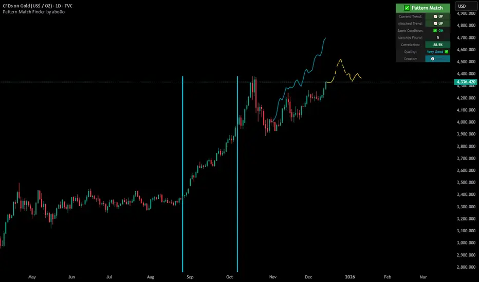 This indicator finds historical price patterns that look similar to your current price action and projects what might happen next based on what happened after those past patterns.