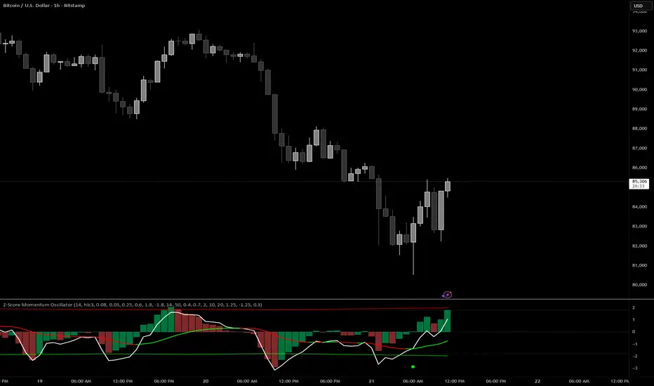 This advanced indicator transforms price action into a statistically normalized momentum oscillator using Z-Score methodology, enhanced with proprietary smoothing algorithms and adaptive coloring logic. The system detects moments when price movement is statistically significant, filtering out market noise while highlighting high-probability reversal and continuation points.