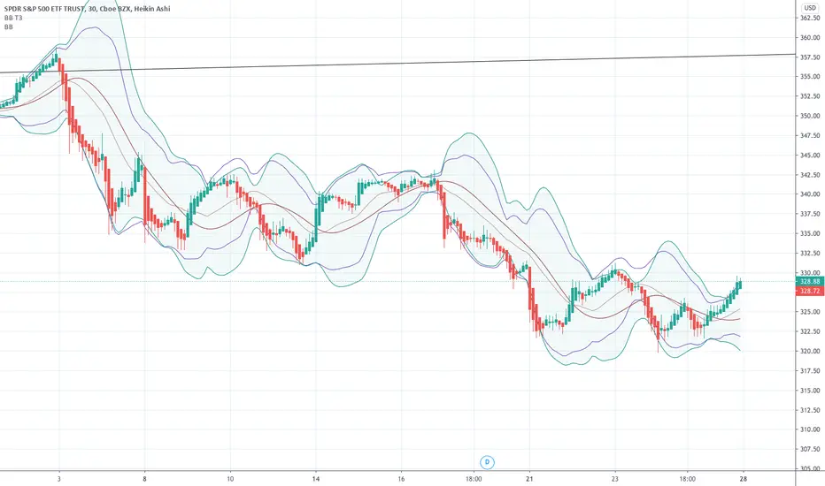 The Bollinger Band is a popular indicator due to it's ability to accurately predict future ranges based on prior volatility. However the bands can fluctuate wildly as a result of acute changes to the price. This results in a channel that is sensitive though replete with sharp angles. Replacing the simple moving average basis line with a Tillson T3 moving average results in a smoother albeit slower basis line. Deriving the bands from partially smoothed data results in more continuous bands than those of the original equation.