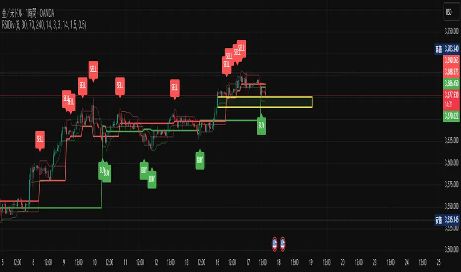 このインジケーターは、短期RSIの押し目/戻りシグナルと、長期足RSIによるダイバージェンスを組み合わせて、買い・売りのチャンスを可視化します。