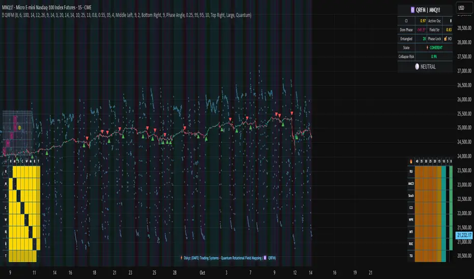 Quantum Rotational Field Mapping applies complex-plane mathematics and phase-space analysis to oscillator ensembles, identifying high-probability trend ignition points by measuring when multiple independent oscillators achieve phase coherence. Unlike traditional multi-oscillator approaches that simply stack indicators or use boolean AND/OR logic, this system converts each oscillator into a rotating phasor (vector) in the complex plane and calculates the Coherence Index (CI)—a mathematical measure of how tightly aligned the ensemble has become—then generates signals only when alignment, phase direction, and pairwise entanglement all converge.