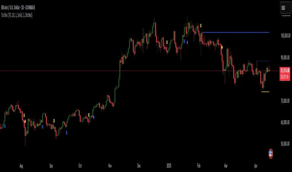 This indicator helps traders identify potential breakout levels based on the highest high and lowest low of the last N candles, inspired by the classic Turtle Trading strategy. The period (N) is fully customizable, allowing you to adapt it to your trading style. For daily charts, a period between 50 and 100 is recommended.