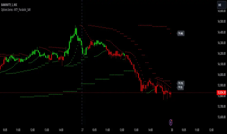 This script, titled "Options Series - MTF_Parabolic_SAR," is designed for analyzing price trends using the Parabolic SAR (Stop and Reverse) indicator across multiple timeframes (MTF). It dynamically highlights bullish and bearish conditions, helping traders identify trends with improved accuracy. The script uses the Parabolic SAR across three customizable timeframes (default: 5, 15, and 60 minutes) to gauge the market sentiment.