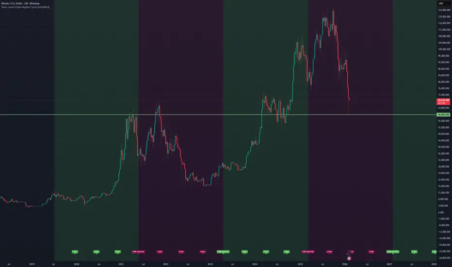 This indicator maps long-duration market regimes using a simplified solar–lunar cycle framework inspired by eclipse sequencing.The model divides time into repeating “eclipse seasons” (~6 months) and tracks regime state by counting events of a single type: