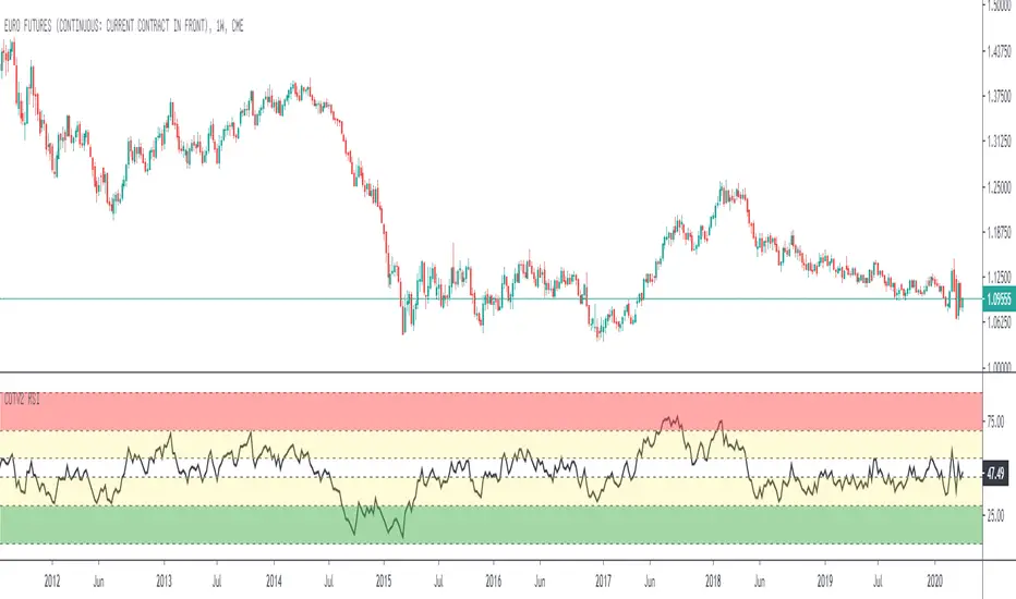 Standard Relative Strenght Indicator with coloured value areas. The red area shows a strong overbought level, what can be used as an warning signal for a trend reversal into downtrend.