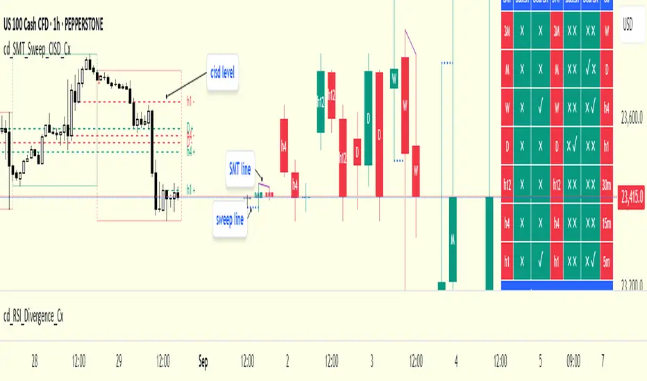 This indicator is designed to show trading opportunities after sweeps of higher timeframe (HTF) highs/lows and, if available, Smart Money Technique (SMT) divergence with a correlated asset, followed by confirmation from a lower timeframe change in state delivery (CISD).