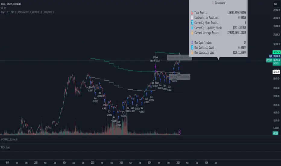 This script provides a detailed simulation of a Dollar-Cost Averaging (DCA) strategy tailored for crypto traders. It allows users to visualize how their DCA strategy would perform historically under specific parameters. The script is designed to help traders understand the mechanics of DCA and how it influences average price movement, budget utilization, and trade outcomes.
