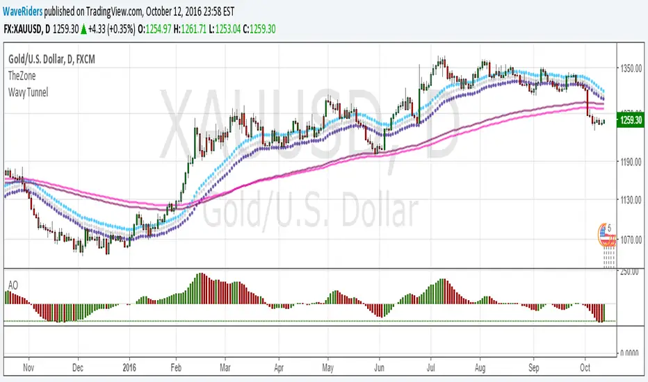 2. Price above both Wavy & Tunnel = Uptrend , Price below both Wavy & Tunnel = Downtrend
