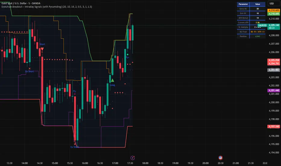 This indicator implements a Donchian Channel breakout system with advanced position management features designed for intraday and swing trading. It combines classic trend-following entry logic with modern risk management techniques including ATR-based stops, breakeven protection, and pyramiding capabilities.