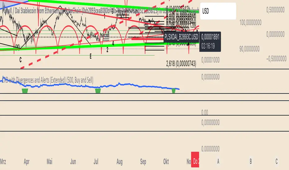 • Marks divergences with green (bullish) and red (bearish) triangle shapes on the chart.