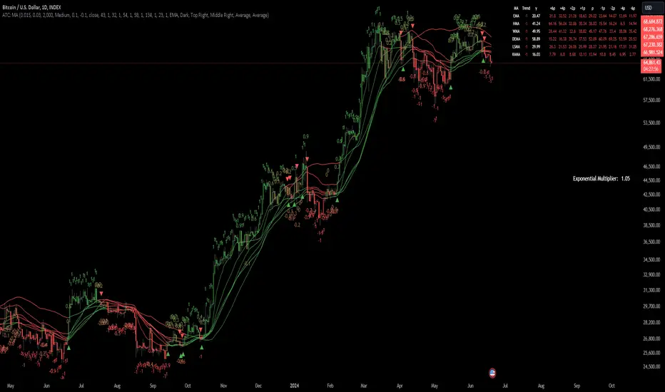 The Adaptive Trend Classification (ATC) Moving Averages indicator is a robust and adaptable investing tool designed to provide dynamic signals based on various types of moving averages and their lengths. This indicator incorporates multiple layers of adaptability to enhance its effectiveness in various market conditions.