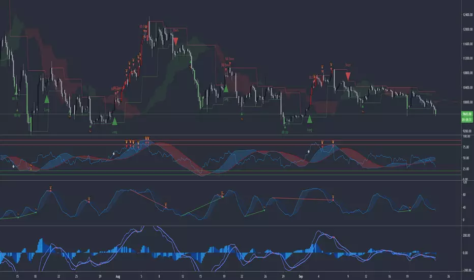 7. Bollinger Band with long/short signals. Signals are given when BB hit upper/lower. This can give alot of bad signals so this can be turned of so the BB signals only are given when RSI is at overbough/oversold.