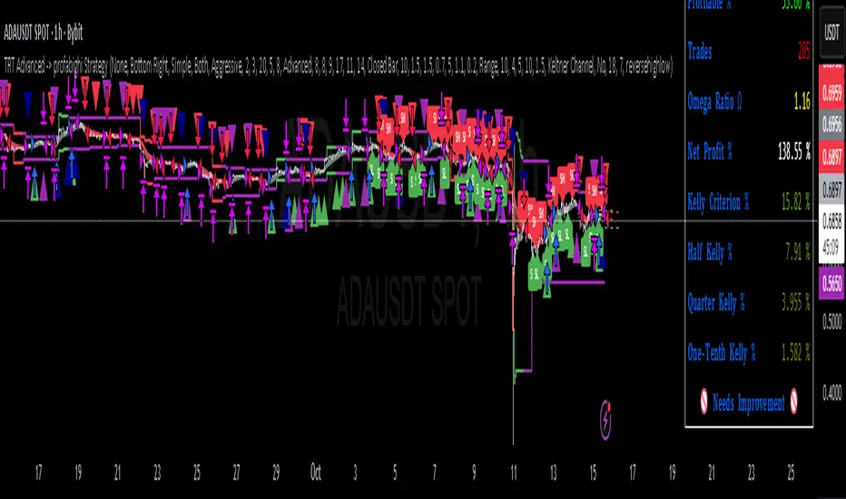 The Trading/Range Tracker Advanced Strategy is a fully automated swing breakout trading system that combines impulsive candle filtering, multi-channel range/trend detection, and EMA confirmation for systematic trade execution. It features ATR-based market regime classification, separate swing detection for entries and risk placement, dual-mode EMA frameworks, and comprehensive performance metrics for backtesting optimization.