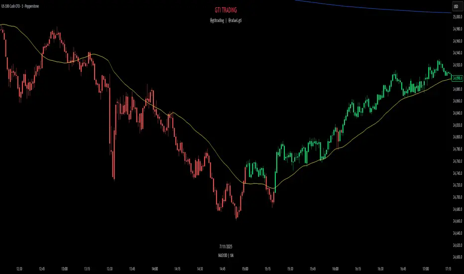 The GTI Trend is a trend-detection indicator that highlights potential market direction by coloring candles based on internal analysis of higher timeframe momentum and price action behavior.