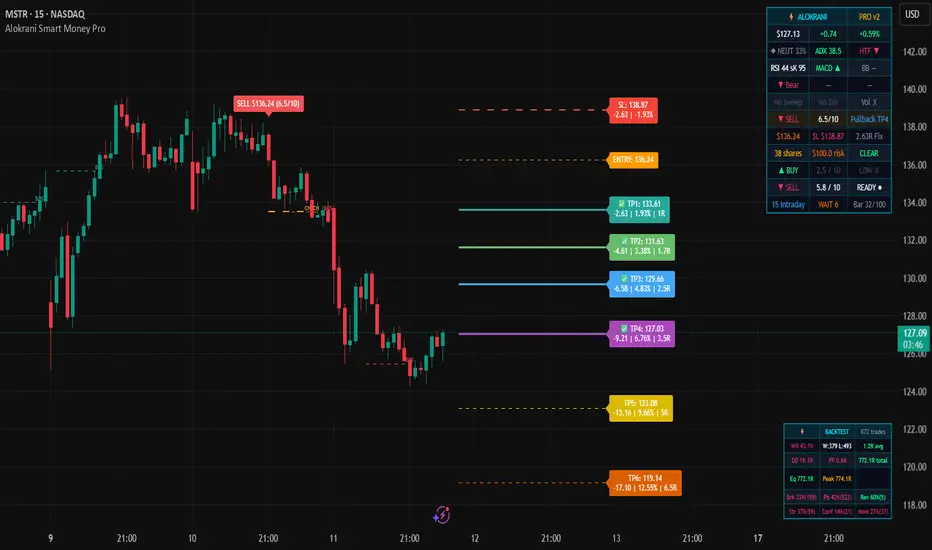 Alokrani Smart Money Pro — Institutional-Grade Stock & SPAC IndicatorAlokrani Smart Money Pro is a professional TradingView indicator that combines Smart Money Concepts (SMC) with multi-factor confluence scoring to generate high-probability BUY/SELL signals for stocks and SPACs. Built on institutional trading principles, it features R-based adaptive targets, a 3-tier cooldown system, and a real-time neon dashboard — all in one overlay indicator.