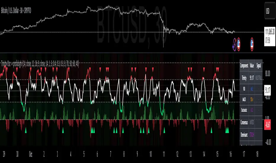 The Trinity Oscillator → PROFABIGHI_CAPITAL fuses normalized signals from RSI, MACD, and Stochastic into a weighted composite for holistic momentum assessment, amplifying turning points and divergences across multiple oscillators.
