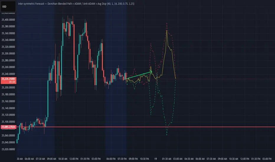 It projects a short polyline path from the current price and shows how that path adapts when the market shifts from ranging to trending (via ADX).
