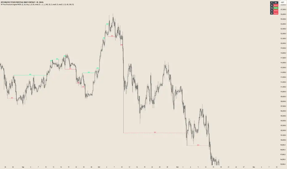 RF True Structure Engine is a clean market-structure tool built on Williams fractals to map the current leg’s Strong/Weak Highs & Lows, detect BOS and MSS (Market Structure Shift / CHoCH), and optionally display a higher-timeframe structure overlay plus a multi-timeframe bias table.