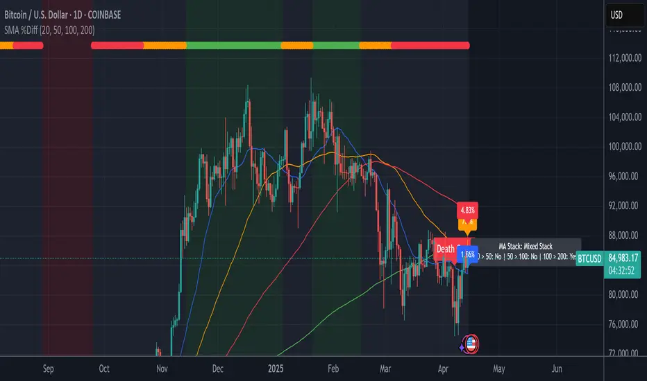 🟩 Background Ribbon: Green for bullish stack, red for bearish, gray when mixed