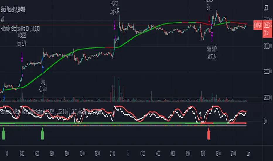 Note: To help visual identification of trade entries and exits you may wish to add the Hull Suite and Volatility Oscillator to the chart separately. It was not possible to display them in a clear way within a single panel for the strategy. Make sure you set the settings of the auxiliary indicators to match what is in the settings of this indicator if you do decide to add them.