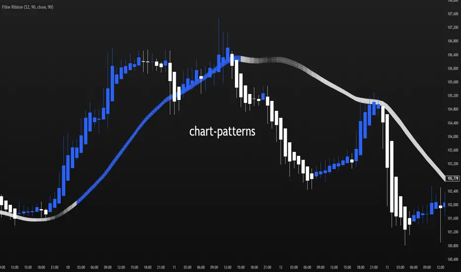 Filter Ribbon is a minimalistic yet powerful trend visualization tool that leverages linear regression slope ordering to determine directional momentum. It analyzes the ordering of regression values over a defined lookback period and quantifies how consistently the price has been trending upward or downward.