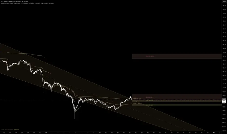Rather than stacking four separate indicators — consuming four of TradingView's limited indicator slots and producing inconsistent color schemes — this tool unifies them under a shared visual identity system with three color schemes that cascade across all components simultaneously. More importantly, the components are designed to work as an analytical hierarchy: the adaptive trend channel defines the macro regime, VWAP establishes institutional fair-value anchors within that regime, order blocks identify specific institutional entry/exit zones, and moving averages provide dynamic confirmation levels.