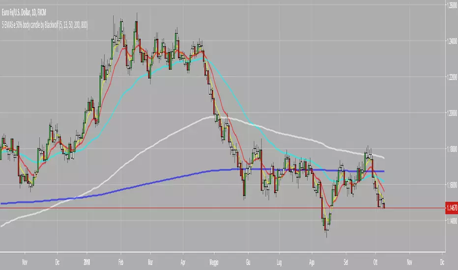 Script to visualize 5 EMAS at period 5, 13, 50, 200, 800 for Daily timeframe and also it shows 50% bodycandle.